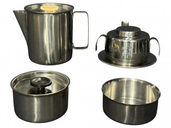• METAL INOX / HERCULES - Lote com (5) peças confeccionadas em metal inox , sendo 4 da manufatura Hercules , sendo (A) - 1 bule para café , med : 13 x 17 x 11 , (B) - 1 manteigueira , med : 6 x 10 , (C) - 1 açucareiro , med : 9 x 13 x 10 e (D) - 1 bowl , med : 5 x 11 e (E) - 1 pratinho , med : 13,5 cm