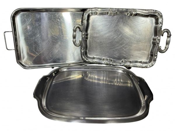• METAL INOX - Lote com (3) bandejas confeccionadas em metal inox , tamanhos , modelos e decorações distintas , medida da peça menor : 48 x 32 cm e medida da maior : 56 x 32 cm , uma possui pequena mossa na alça .
