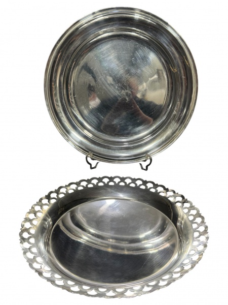 • METAL PRATEADO - Lote com (2) pratos em metal espessurado à prata , sendo (A) - 1 com bordas vazadas da manufatura Regência , medida : 29 cm e (B) - 1 com bordas frizadas , medida  : 33 cm