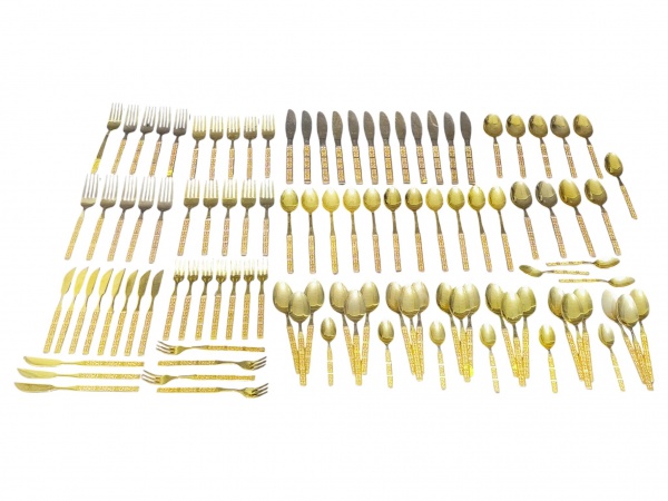 • FAQUEIRO, cento e quatro (104) peças confeccionado em metal dourado com cabo cinzelado poir elementos florais e vegetalistas, sendo: A) 12 facas para jantar serrilhadas, B) 9 garfos para jantar, C) 9 colheres de sopa, D) 10 garfos para sobremesa, E) 22 colheres para sobremesa, F) 11 colheres para sobremesa com cabo longo, G) 11 facas para bolo, H) 11 garfos para bolo e I) 9 colheres para chá. Apresentam falhas na douração.