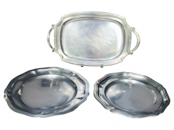 • AÇO INOX - Lote com (3) peças confeccionadas em aço inox sendo (2) travessas redondas e (1) bandeja retangular da manufatura wolff , medida da peça maior : 32 cm e medida da peça menor : 29 cm