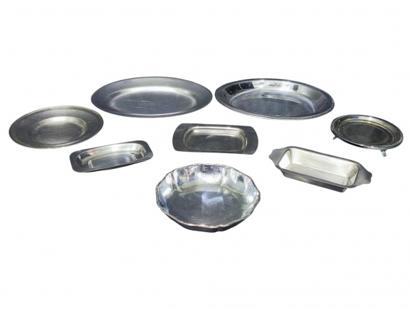 • METAL PRATEADO INOX, lote com oito (8) peças confeccionadas em aço inox, sendo 2 travessas ovais, 3 pequenas bandejas retangulares, 1 salva, 1 uveira e 1 prato redondo, maior peça medindo 30,5x20,5cm e menor 16x8cm.