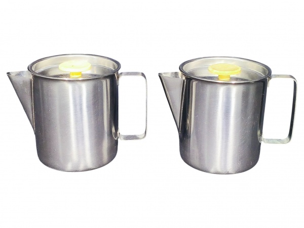 • METAL PRATEADO INOX, dois (2) bules confeccionados em aço inox da manufatura HERCULES, pega em material sintético com desgastes, medindo 12x16x11cm.