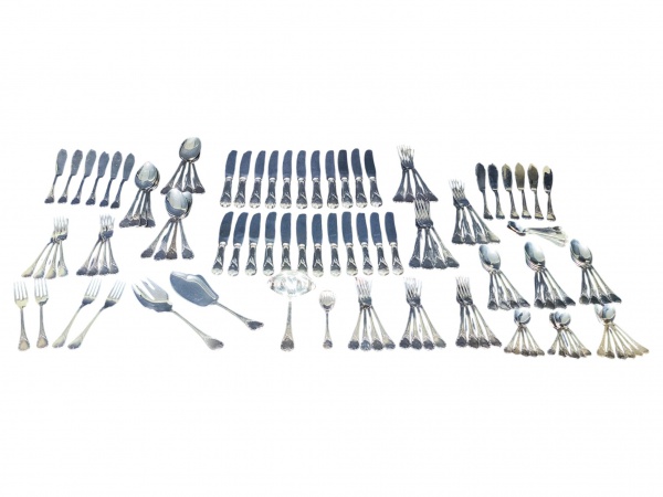 • FAQUEIRO, cento e vinte uma peças (121) confeccionadas em aço inox da manufatura HERCULES INOX com cabo cinzelado em arabescos e folhagens, sendo: A) 11 facas para jantar serrilhadas, B) 12 garfos para jantar, C) 12 colheres para sopa, D) 12 facas para sobremesa serrilhadas, E) 12 garfos para sobremesa, F) 12 colheres de sobremesa, G) 12 facas para peixes, H) 12 garfos para peixes, I) 11 colheres para chá, J) 11 colheres para café e K) 4 peças para servir: 1 garfo e 1 espátula para peixes, 1 concha para molhos e 1 colher de açucar.