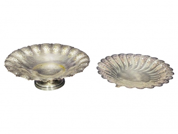 • METAL PRATEADO, lote com duas (2) fruteiras confeccionadas em metal espessurado a prata das manufaturas REGIA e AUREA, ambas com cinzelado floral em vazados, ambas bordas em ondulações, uma de pé (apresentando falhas na prateação e mossa na base) e outra apoiada sobre 3 pés curvos, medindo 5x24cm e 10x25cm.
