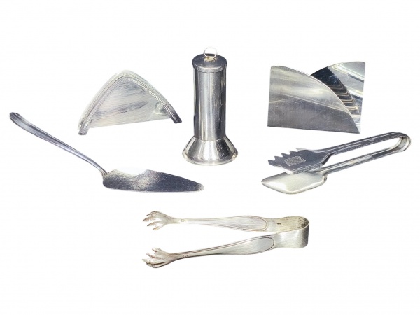 • METAL PRATEADO, lote com seis (6) peças confeccionadas em aço inox, sendo: A) 1 paliteiro, apresentando mossa na tampa, medindo 13,5cm, B) 2 porta guardanapos, medindo 8,5x12cm e 7,5x14cm, C) 1 pá para bolo, D) 1 pegador de salada e E) 1 pegador de gelo em metal espessurado a prata.