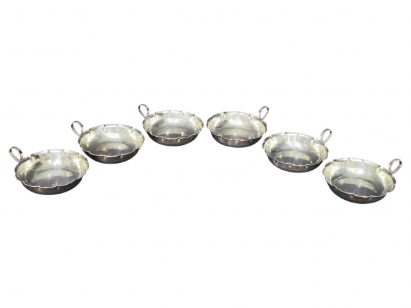 • AÇO INOX / MERIDIONAL - Lote com (6) recipientes para sobremesa confeccionados em aço inox da manufatura Meridional , bordas frisadas e alças vazadas , medida : 4 x 10 x 10 cm