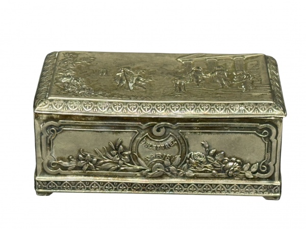 • METAL PRATEADO, uma (1) caixa porta joias confeccionada em metal espessurado a prata ricamente trabalhada em alto-relevo, apresentando cena neoclássica na tampa, com figuras humanas em ambiente bucólico e arquitetônico (colunata clássica), possivelmente inspirada em temas greco-romanos. Bordas decoradas com friso contínuo ornamentado, laterais com molduras em relevo e motivos florais em destaque, leves mossas e falhas no banho, medindo 5,5x12x7,5cm.