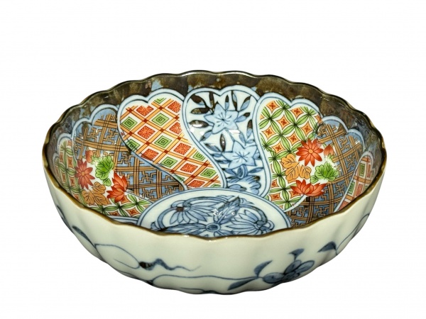 • PORCELANA ORIENTAL, um (1) bowl em porcelana na tonalidade branca, apresentando borda ondulada com acabamento dourado, decoração policromada no interior em painéis segmentados com motivos florais, geométricos e arabescos de inspiração oriental, centro ornado por medalhão circular floral em azul sob o vidrado; parte externa decorada em azul sob fundo claro, com motivos florais e elementos orgânicos, fundo marcado, medindo 5x14cm.