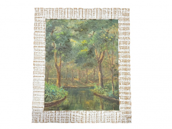 • QUADRO, "Cena Ribeirinha", sem assinatura aparente, óleo sobre eucatex, moldura em madeira com vestígios de patina branca, medindo 39,5x50cm e obra 30x40cm.