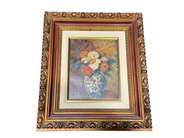 • QUADRO, uma (1) composição floral intitulada Vase de Fleurs, reprodução autorizada da obra de Paul Cézanne, editada por Les Éditions Braun, Paris. Imagem impressa representando natureza-morta com arranjo floral em vaso, em paleta rica e vibrante, inspirada no pós-impressionismo francês, moldura e madeira nobre com entalhes vegetalistas e patina escura, medindo 48,5x42,5cm e tela 21x26cm.