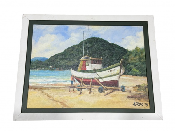 • ELSIO (?), "Cena Marítima", óleo sobre tela, datado de 2014, apresenta leves manchas na tela, moldura em madeira com pintura branca, medindo 36,5x46,5cm e tela 30x40cm.