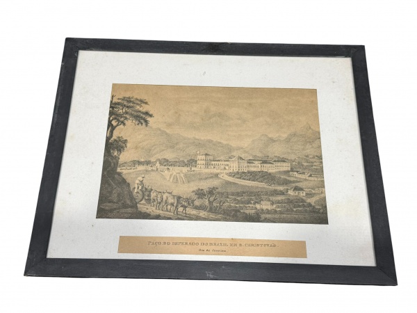 • QUADRO, uma (1) gravura, vista histórica do Paço de São Cristóvão, intitulada Paço do Imperador do Brazil em S. Christovão  Rio de Janeiro, composição panorâmica com o antigo complexo imperial, áreas ajardinadas, edificações e elementos rurais em primeiro plano, típica representação do século XIX. Gravura em monocromia / sépia, montada em passe-partout e acondicionada em moldura de madeira com acabamento em tom escuro, medindo 32x40cm.