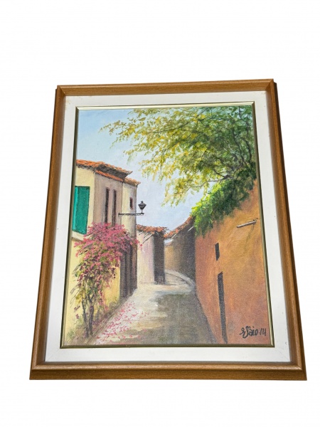• ELSIO (?), "Cena Urbana", óleo sobre tela, datado de 2014, moldura em madeira clara, medindo 48x38cm e tela 40x30cm.