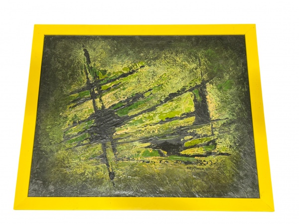 • DULCE M. WEYTINGH D'ALMEIDA, "Arte Abstrata", tela colada sobre placa de estuque, moldura em madeira com pintura amarela, medindo 36,5x44,5cm e obra 32x40cm.