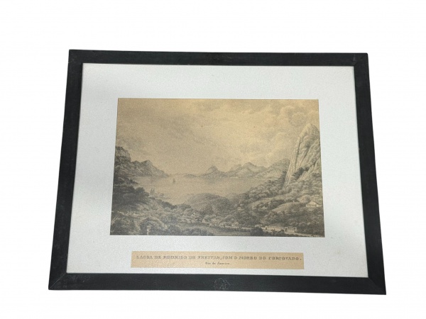 • QUADRO, uma (1) gravura, vista histórica do Corcovado, intitulada Lagoa de Rodrigo de Freitas, com o Morro do Corcovado  Rio de Janeiro, composição panorâmica com paisagem natural, relevo montanhoso, vegetação densa e a lagoa ao centro, representação característica do século XIX. Gravura em monocromia / sépia, montada em passe-partout e acondicionada em moldura de madeira com acabamento em tom escuro, medindo 32x40cm.