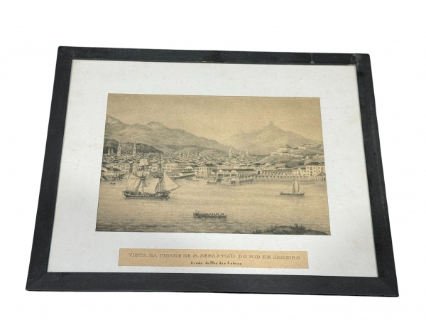 • QUADRO, uma (1) gravura, vista panorâmica histórica da cidade do Rio de Janeiro, intitulada Vista da Cidade de S. Sebastião do Rio de Janeiro, tirada da Ilha das Cobras, apresentando casario colonial, relevo montanhoso ao fundo e embarcações à vela na Baía, composição típica do período imperial. Gravura em monocromia / sépia, montada em passe-partout e acondicionada em moldura de madeira com acabamento em tom escuro, medindo 32x40cm.