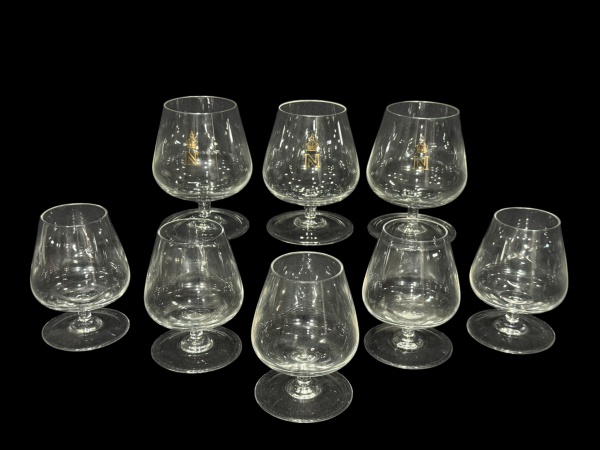 • DEMI-CRISTAIS, oito (8) copos para coquetel confeccionados em demi-cristal translucido, corpo bojudo, haste cilíndrica, apoiada sobre base circular, 3 maiores apresenta monograma decorativo com letra N e coroa em dourado, maiores medindo 12,5x6,5cm e menores 11x5cm.