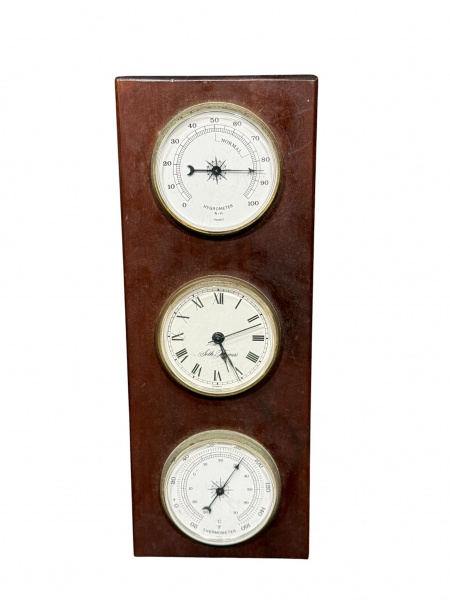 • RELÓGIO, um (1) conjunto de mesa triangular confeccionado em madeira, composto por três instrumentos: higrômetro (umidade), relógio analógico com algarismos romanos e termômetro (temperatura), todos com mostradores circulares e aros metálicos. Peça de caráter decorativo e funcional, típica de produções do século XX, todos 3 com aro em metal dourado com sinais de oxidação, medindo 10,5x28,5x10,5cm.