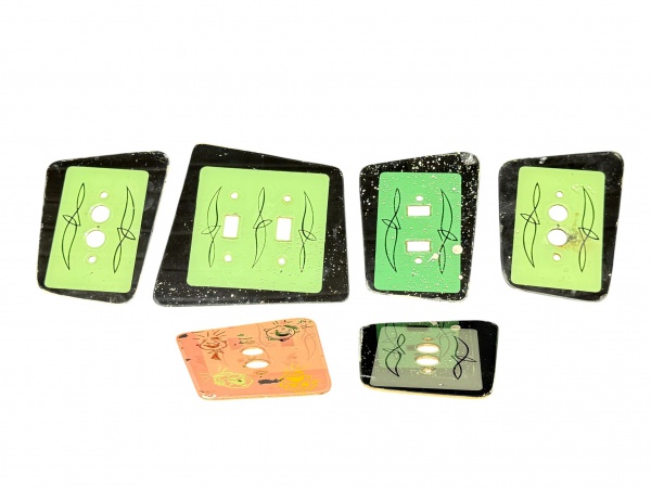 • VIDROS, lote com seis (6) espelhos de interruptor confeccionadas em vidro, com decoração geométrica e abstrata, predominância de tons verde, preto e cobre, apresentam manchas de tinta e 2 com falhas na pintura e bicados, maior medindo 16,5x16cm e menor 14,5x10,5cm.