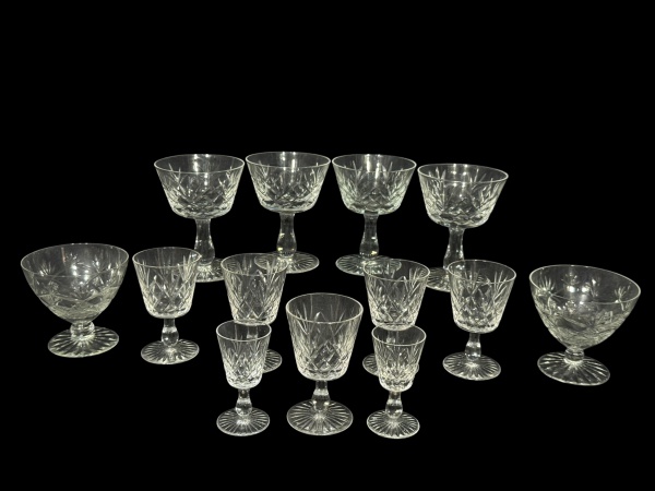 • CRISTAIS, lote com treze (13) taças distintas confeccionadas em cristal translucido com lapidação de palmas e elementos geométricos em baixo relevo, haste balaustre, apoiada sobre base circular com fundo estrelado, sendo: A) 4 para champanhe/sobremesa, medindo 11x8cm (1 bicada), B) 2 para champanhe/sobremesa de modelo distinto, medindo 8x8,5cm, C) 5 para vinho, medindo 9x5,5cm e D) 2 para licor, medindo 7,5x4cm.