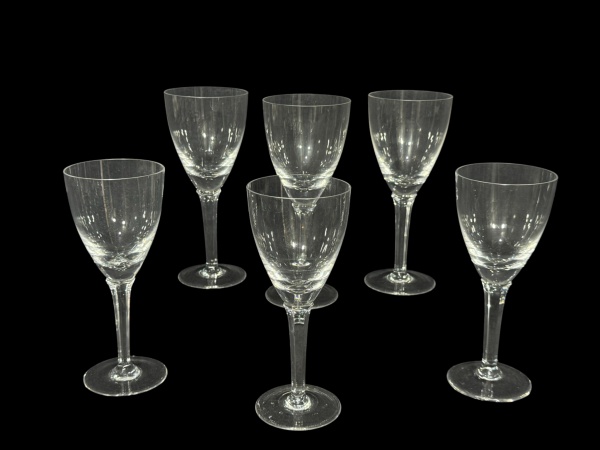 • CRISTAIS, seis (6) taças para água confeccionadas em cristal translucido, haste facetada, apoiada sobre base circular, medindo 19x8cm.