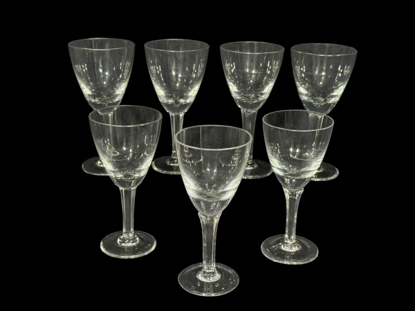 • CRISTAIS, sete (7) taças para vinho confeccionadas em cristal translucido, haste facetada, apoiada sobre base circular, medindo 14x7cm. 3 bicada na borda.