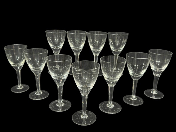 • CRISTAIS, onze (11) taças para vinho confeccionadas em cristal translucido, haste facetada, apoiada sobre base circular, medindo 16x7,5cm.