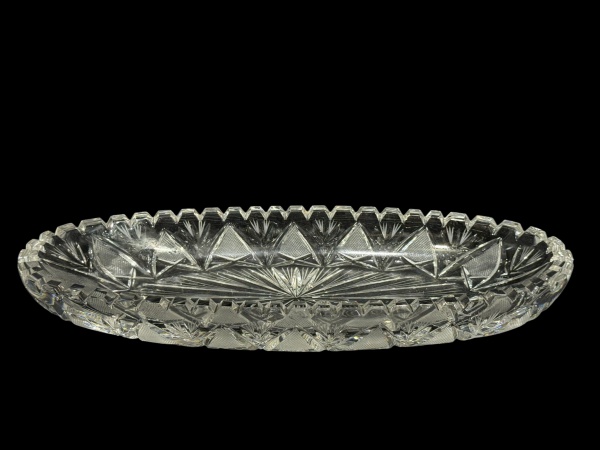 • CRISTAL, um (1) centro de mesa oval confeccionado em cristal translucido com rica lapidação de palmas, pingos de diamante, sulcos e elementos geométricos em baixo relevo, borda dentada e fundo estrelado medindo 4,5x34x12cm.