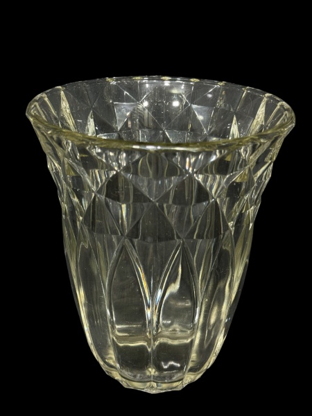 • Val Saint-Lambert (Seraing, Bélgica, 1826), um (1) vaso confeccionado em vidro belga translucido com lapidação geométrica em baixo relevo, marcado no fundo, medindo 20x17cm.