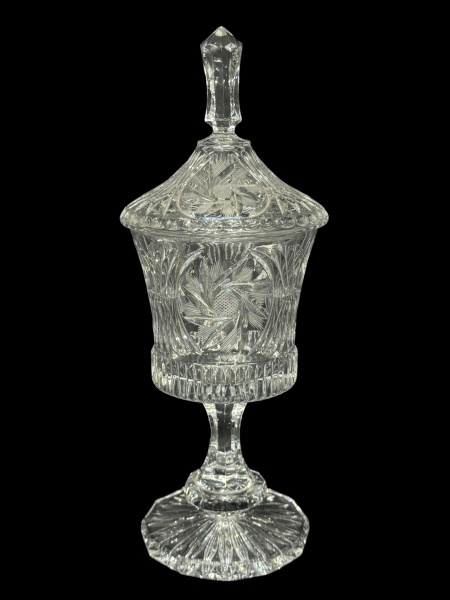 • CRISTAL, uma (1) grande compoteira confeccionada em cristal translucido com lapidação de caneluras, cata ventos, pingos de diamante e palmas em baixo relevo, pega da tampa e haste facetada, apoiada sobre base com fundo estrelado, medindo 38x13,5cm.