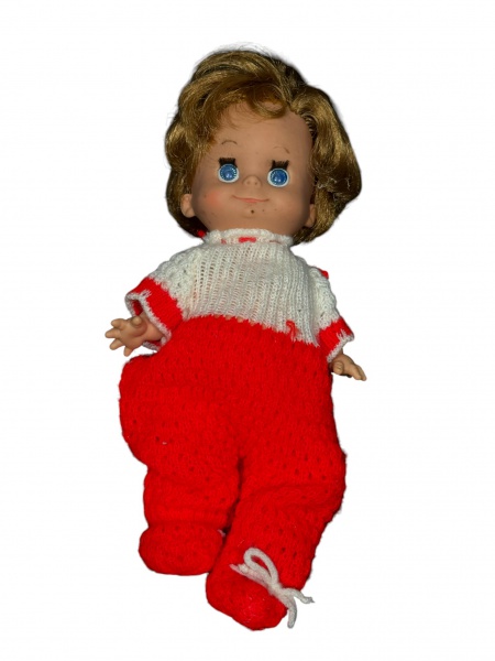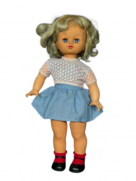 • COLECIONISMO, uma (1) boneca de coleção MÃEZINHA da marca ESTRELA confeccionada em plástico rígido, cabelos em tom loiro, vestes em tecido nas tonalidades azul e branca, costas com compartimento para pilhas faltando tampa, medindo 48cm de altura.