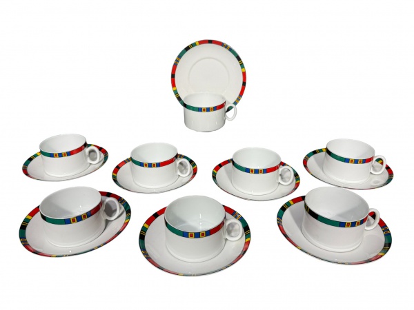 • PORCELANA RENNER, oito (8) xícaras para chá com seus respectivos pires confeccionados em porcelana da coleção dita COLORÉ, borda decorada por elementos geométricos de tonalidades distintas, medindo 5x10,5x8cm, 1 pires bicado e 1 xícara bicada e 1 píres com ínfimo fio de cabelo na borda.