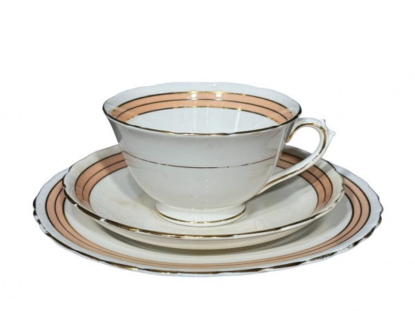 • TUSCAN (Foi criada por R. H. & S. L. Plant Ltd., fundada por volta de 1898 na região de Staffordshire, mais precisamente na fábrica denominada Tuscan Works, em Longton, Stoke-on-Trent), trio para chá, sendo: 1 xícara para chá com seu respectivo pires e 1 prato para bolo, confeccionado em faiança inglesa na tonalidade branca, decorados por espessa faixa na tonalidade rose com filetes em ouro, medindo 5,5x12x9,5cm e prato para bolo 17cm. Apresentam leves falhas na douração.