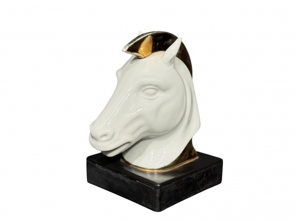 • ESCULTURA, uma (1) escultura confeccionada em porcelana na tonalidade branca representando cabeça de cavalo, crina em ouro e base esmaltada em tom preto fosco, medindo 17x15,5x11cm. Leves falhas na douração.