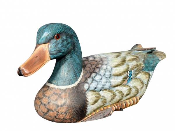 • ESCULTURA, uma (1) escultura confeccionada em madeira representando marreco esmaltado em tonalidades naturais, medindo 19x38,5x13cm, apresenta fissura no pescoço, mas sem sinal de cola.