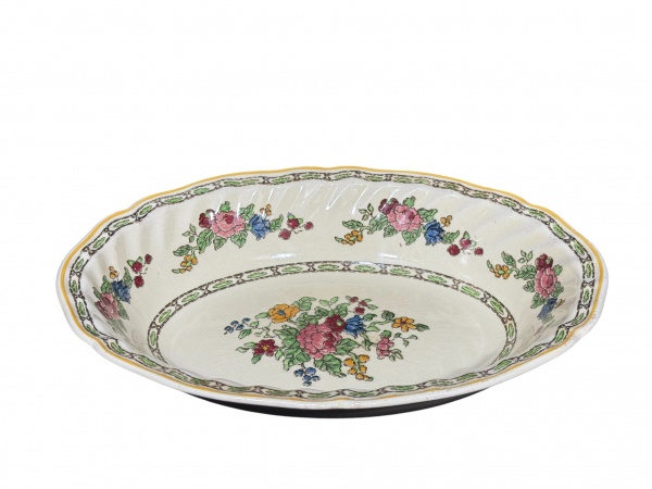 • ROYAL DOULTON (A empresa foi fundada em 1815, em Lambeth, Londres, por John Doulton, junto com Martha Jones e John Watts), uma (1) travessa funda confeccionada em faiança inglesa vitrificada na tonalidade creme, decorada por flores e folhagens em policromia, borda em recortes com filete amarelo, medindo 5,5x26,5x20cm.