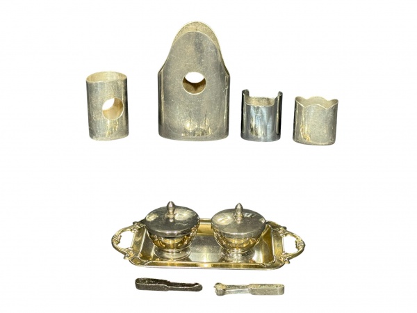 • METAL PRATEADO, lote com nove (9) peças confeccionadas em metal espessurado a prata de modelos, tamanhos e decorações distintas, sendo: A) 4 porta adoçantes, maior medindo 9x6x3cm e menor 3,5x3,5x2cm, B) 2 haldi kumkum confeccionados em aço inox, apoiados sobre bandeja retangular e acompanha duas pinças (usado para guardar e servir açafrão (haldi) e pó vermelho (kumkum) em rituais hindus), medida dos potes 4x4cm e bandeja 14x7,5cm.