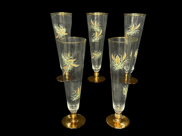• VIDROS, cinco (5) tulipas confeccionadas em vidro translucido com pintura de trigais e folhagens em policromia, haste gomada e base circular em vasta douração, medindo 23,5x7cm.