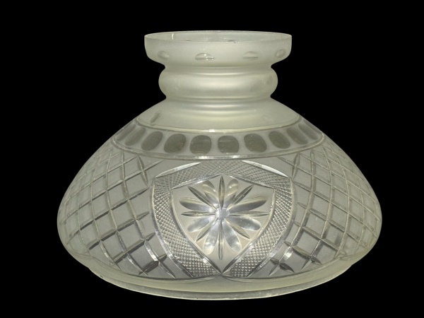 • VIDRO, uma (1) cúpula confeccionada em vidro fosco com rica lapidação de pingos de diamante, losangos, esferas, flores e dedões em baixo relevo, apresenta discretos bicados no encaixe do bocal, medindo 20x13x26,5cm.