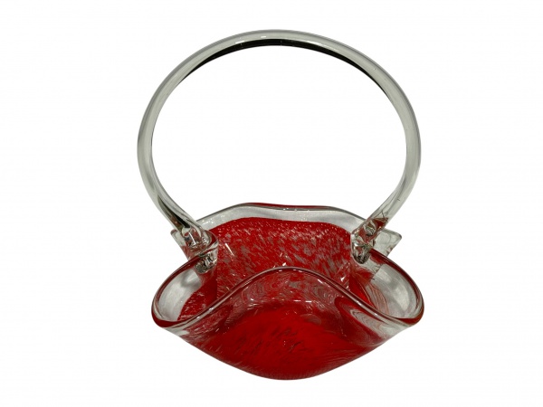 • MURANO, uma (1) cesta decorativa confeccionada em vidro de Murano na tonalidade vermelha, alça translucida e borda com ondualações, medindo 21x16x14,5cm.
