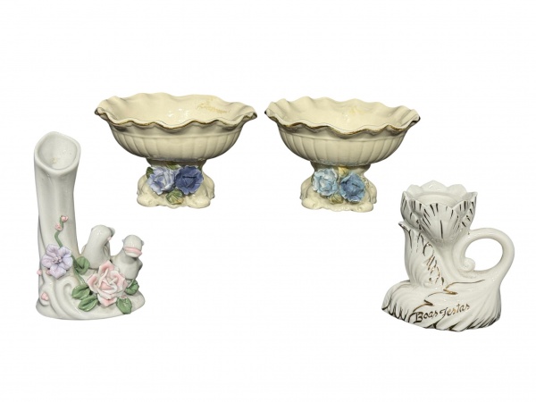 • PORCELANAS, lote com quatro (4) peças, sendo: A) par de bowls/uveiras confeccionadas em porcelana na tonalidade branca, moldada em gomos ao gosto grego, bordas em ondualações filetadas em ouro e base com apliques de flores em relevo e policromia, medindo 7x12cm, B) 1 floreira confeccionada em porcelana branca decorada por patos e elementos florais relevados em policromia, medindo 12cm de altura e C) 1 castiçal palmatória confeccionado em porcelana na tonalidade branca no feitio de flor, ricamente realçado em filetes de ouro e inscrição BOAS FESTAS, medindo 9cm de altura.
