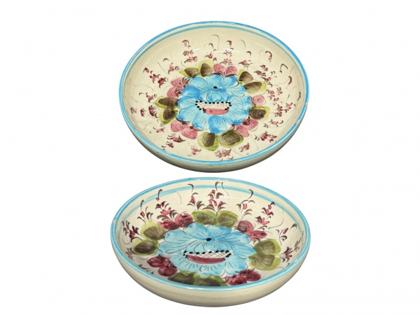 • FAIANÇAS, lote com duas (2) peças, sendo 1 fruteira e 1 prato confeccionadas em faiança vitrificada na tonalidade branca com pintura de flores e folhagens em policromia com filetes na tonalidade azul, fruteira medindo 27cm (bicada na borda) e prato 19,5cm (também, bicado na borda).