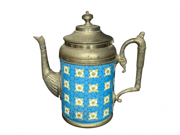 • Manning, Bowman & Co. (1849-1945), um (1) bule para café confeccionado em ágata com pintura floral em policromia e estanho cinzelado por gomos, caneluras e elementos vegetalistas com pega da tampa no feitio de bilro, apresenta desgastes no estanho e necessita solda no bico, medindo 24x24x11cm.