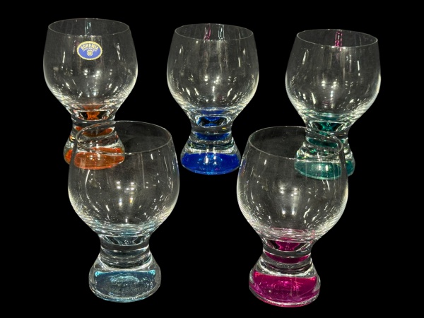 • CRISTAL BOHEMIA, lote com cinco (5) tulipas confeccionadas em cristal translucido com base multicolorida, medindo 12x7cm.