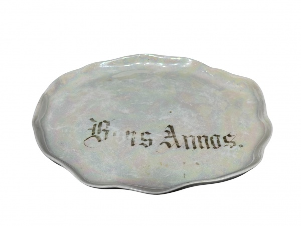 • PORCELANA, uma (1) bandeja oval confeccionada em porcelana na tonalidade branca com esmaltagem furtacor e inscrição em ouro BONS ANNOS, apresentando falhas na douração, medindo 24,5x21,5cm.