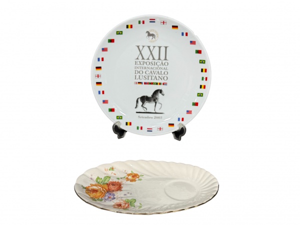 • PORCELANA e FAIANÇA, lote com duas (2) peças, sendo: A) VISTA ALEGRE, XXII EXPOSIÇÃO INTERNACIONAL DO CAVALO LUSITANO, Edição limitada, não numerada de 300 peças, prato decorativo em porcelana na tonalidade branca com pintura de países distintos em policromia, apresenta bicado na borda, medindo 23,5cm e B) 1 pires para biscoito confeccionado em faiança com manufatura apagada, decorada por flores e folhagens em policromia e borda filetada a ouro, sinais de craquele e falhas na pintura, medindo 25x16cm.
