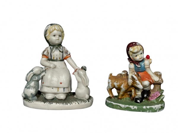• ESCULTURAS, duas (2) esculturas confeccionadas em biscuit representando pequenas camponesas ladeada por animais, apresentando vestígios de pintura em policromia, maior medindo 11x9,5cm e menor 9x7,5x5cm.