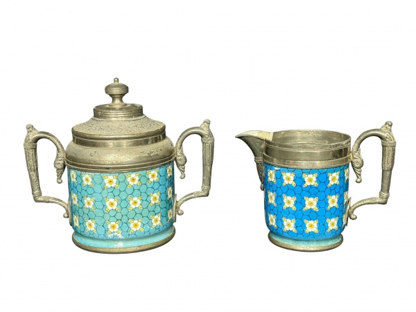 • Manning, Bowman & Co. (1849-1945), lote com duas (2) peças, sendo: A) 1 açucareiro, medindo 16x19x9cm e B) 1 leiteira, medindo 12,5x16x8cm, confeccionados em ágata com pintura floral em policromia e estanho cinzelado por gomos, caneluras e elementos vegetalistas com pega da tampa no feitio de bilro, apresenta desgastes no estanho.
