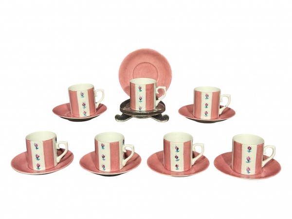 • PORCELANAS, sete (7) xícaras para café com seus respectivos pires confeccionadas em porcelana com pintura listrada na tonalidade rosa e elementos florais em policromia, medindo 4,5x6x4cm.